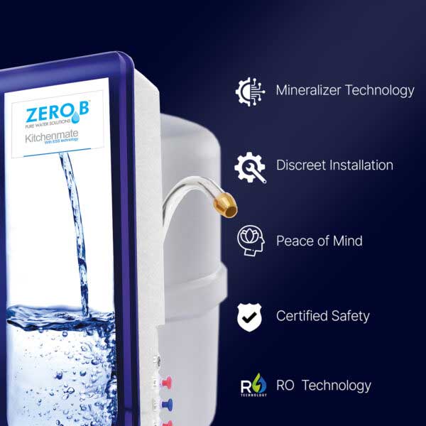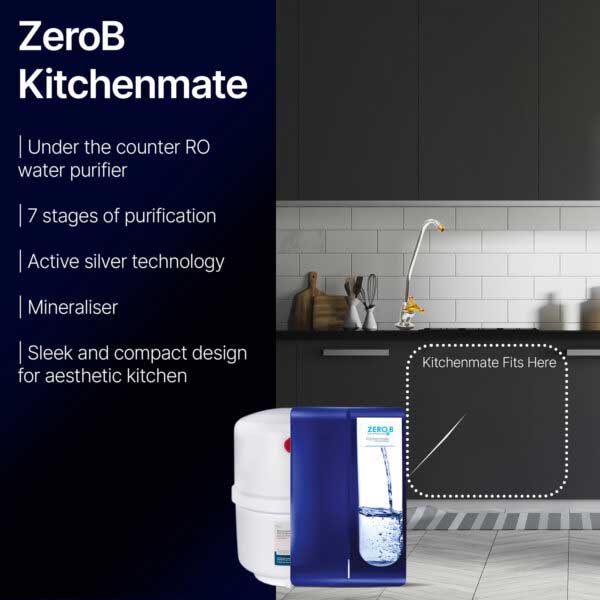 Sleek and compact RO water purifier for your modular kitchen ZeroB Kitchenmate is a sleek and stylish RO+ESS water purifier that enhances the aesthetics of your kitchen, as well as, does not occupy kitchen counter space as it is an Under The Sink model that comes with a complimentary long-reach faucet.
