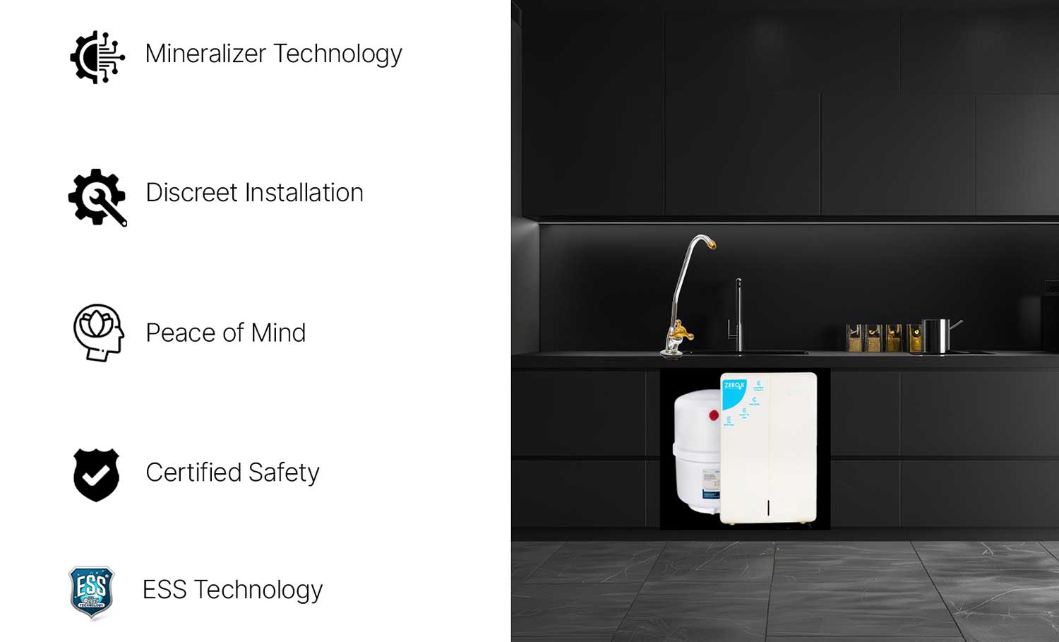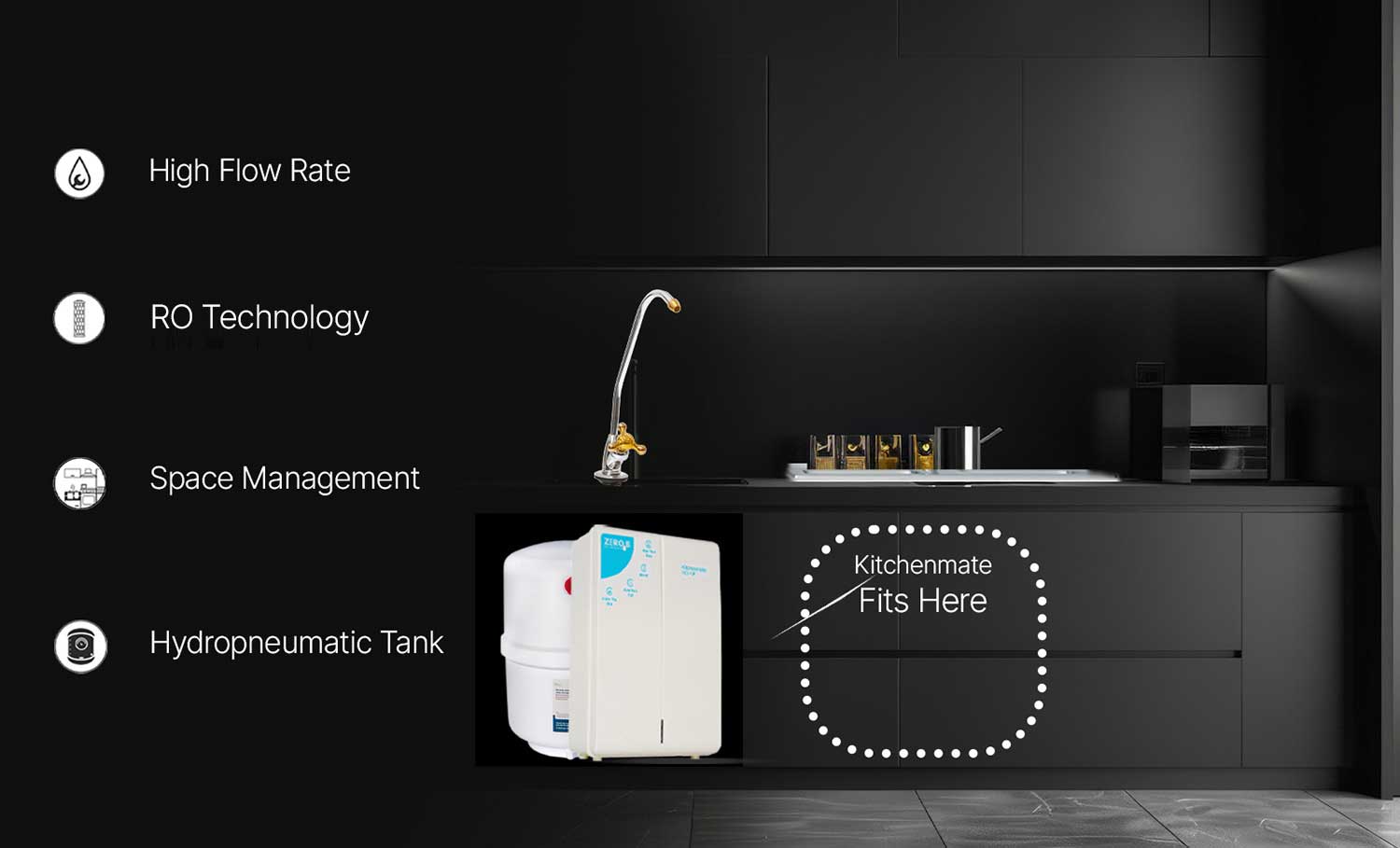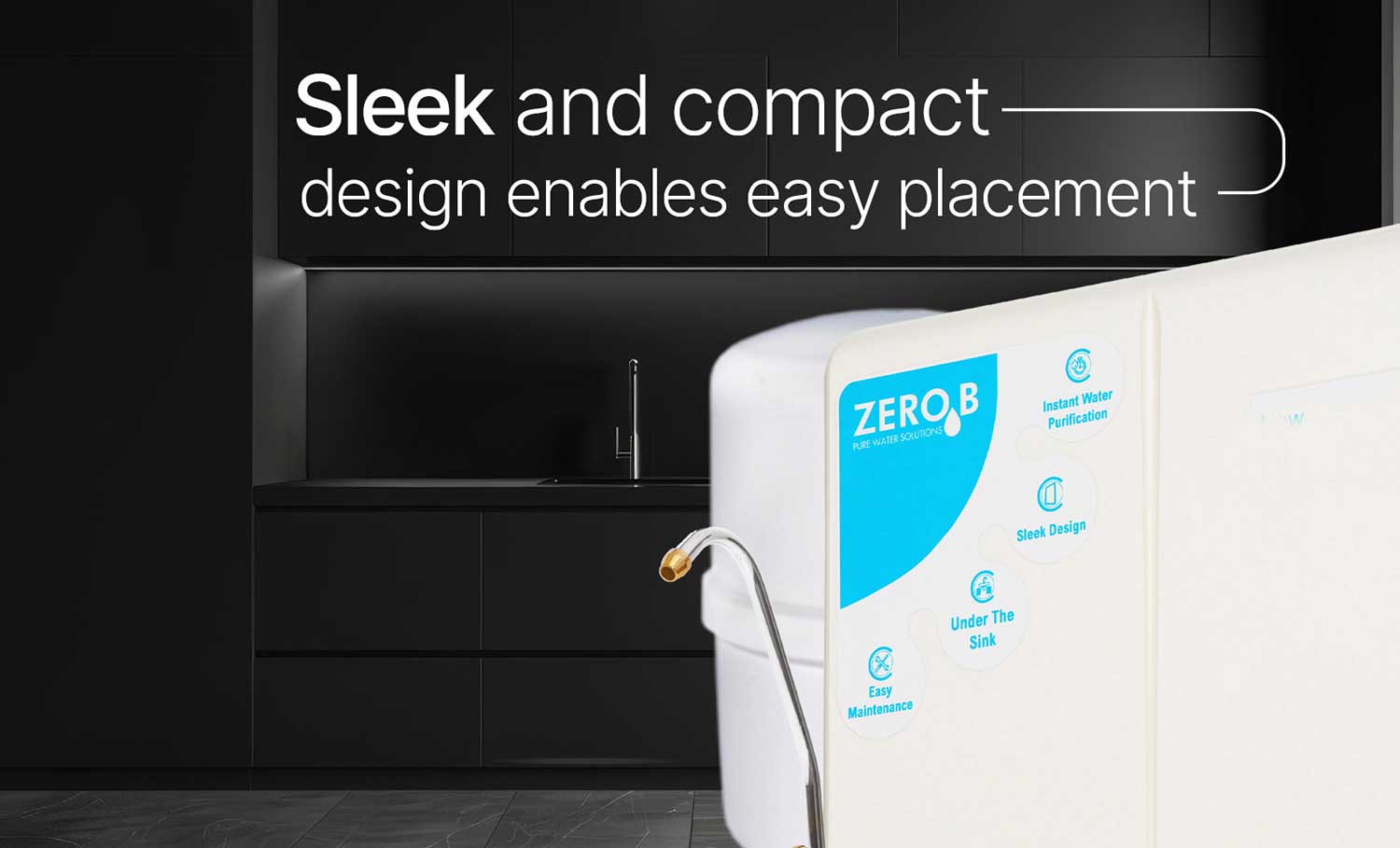 Sleek and compact RO Water Purifier for your modular kitchen. ZeroB Kitchenmate is a sleek and stylish water purifier which enhances the aesthetics of your kitchen, as well as, does not occupy kitchen counter space that comes with a complimentary long-reach faucet.