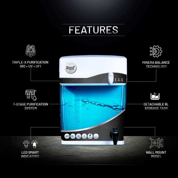 The ZeroB Magna Plus Universal RO is a high-performance water purifier equipped with advanced Triple-X purification technology—combining RO, UV, and UF stages for complete protection. It effectively removes bacteria, viruses, excess salts, heavy metals, and harmful chemicals to deliver safe, crystal-clear water. The purifier features helps retain essential natural minerals for healthier and better tasting water. Its 7-stage purification process ensures multi-level filtration, while the detachable 6-litre storage tank allows for easy maintenance. The compact wall-mountable design, smart LED indicators, and efficient energy consumption make it a powerful yet convenient choice for everyday use.